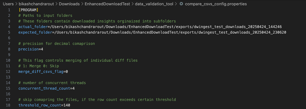 - In the “compare_csvs_config.properties”, update the following parameters.