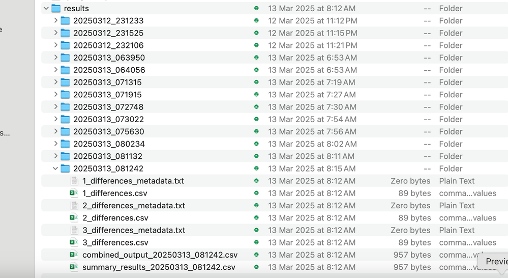 Each comparison results in a timestamped folder. In this folder, we can find individual comparison reports for dashboard insights along with combined outputs for files having differences. The numeric prefix in the file name indicates the row number in the input.csv file.