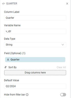 I have created presentation variable with quarter name and given default quarter is Q2/2024.