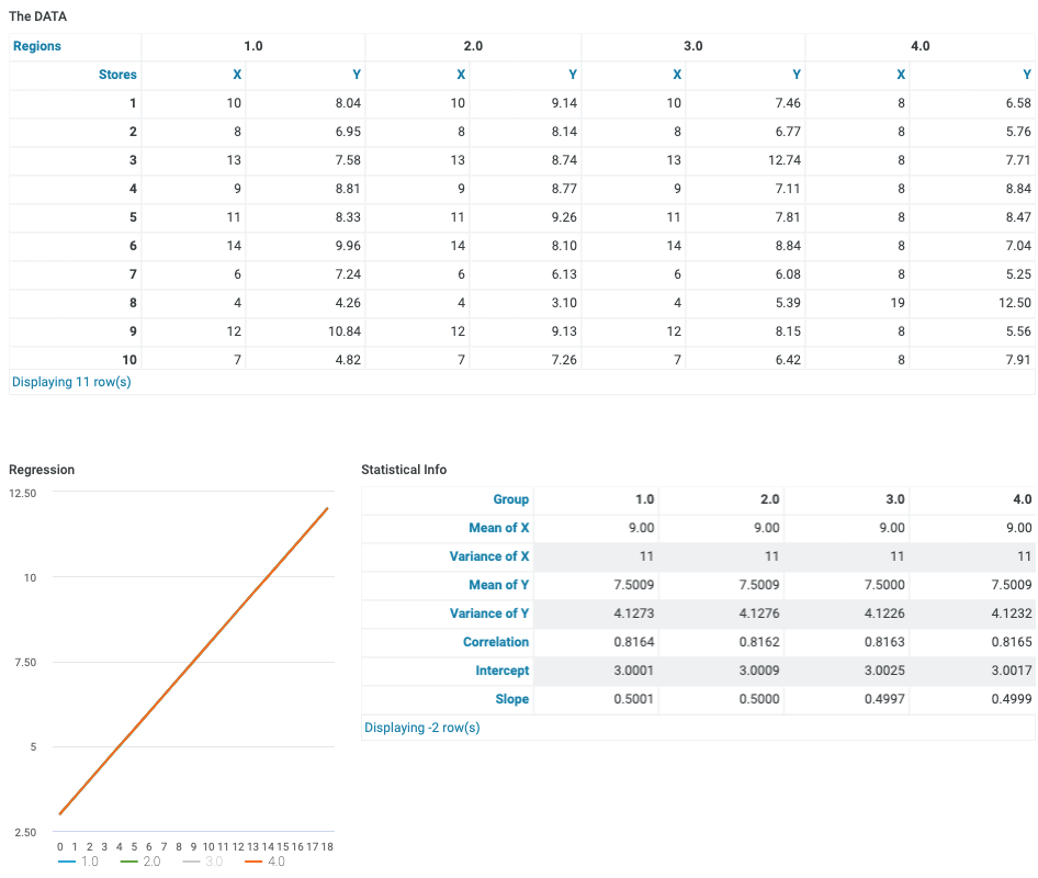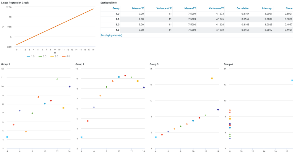 When performing a statistical analysis on the 4 series data sets, you will notice that they have virtually the same properties. The mean, the variance, the correlations and the regression line are all similar in value or identical. This could lead you to believe, based on this information alone, that all 4 series are identical.