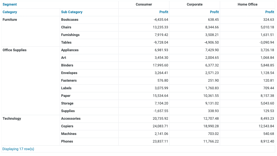 Reading through the table is not intuitive, understanding which combination of product and segment is not performing well is not easy. You may be tempted to introduce a color element, or look at it as a single chart but even that would only help you easily answer one single question. Further questions would require moving to other tables and other pages.