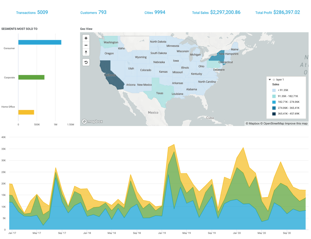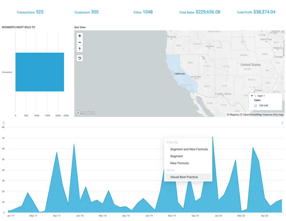 Segment managers can easily drill down to their own segment of focus and look at the best performing regions in couple of clicks. This can quickly understand how their regions are performing and can drill down even further for a more granular understanding. Visual analytics techniques guide an end user in their analysis, and lead them to answer more and more questions as they interact with the dashboard. Some questions do not need to be answered on the main dashboard, but the user could be pointed to that more granular view as they answer their initial question.