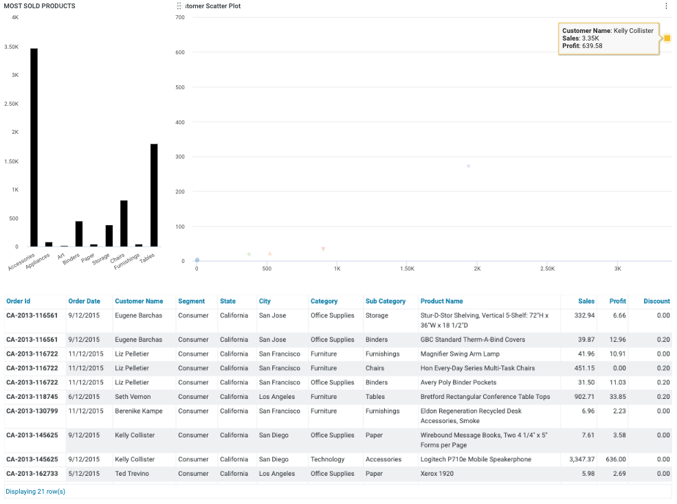 One dashboard, via drill through, can lead to another with more granular data while at the same time filtering it. Instead of looking at a table with million transactions, you will see only the transactions that are of interest to you. In this case, you know which products you sold the most of based on the interaction in the previous dashboard and can make more accurate business decisions.