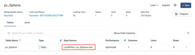 Next, add the spreadsheet as a new data file in Incorta. We will add this file to a schema as a new table. This can be an existing schema or a brand new one. The screenshot below shows my file pv_Options.xlsx loaded to a new schema.