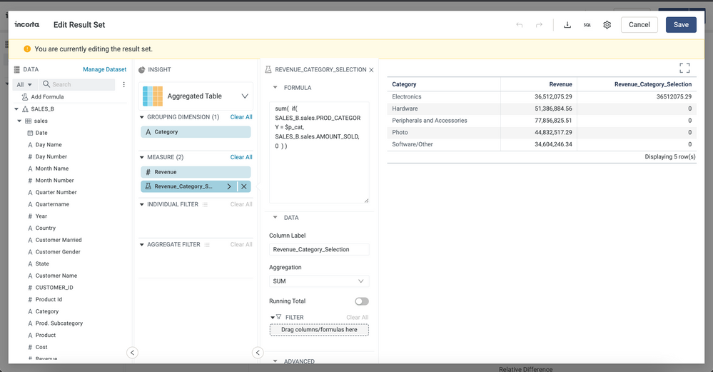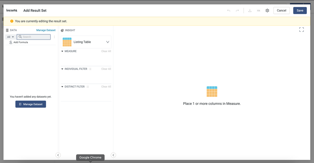 Next, save the result set. You will now be back in the Edit Insight pane of the Analyzer. You can select the result set that you just created under the Manage Dataset -> Result Set section