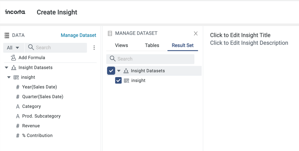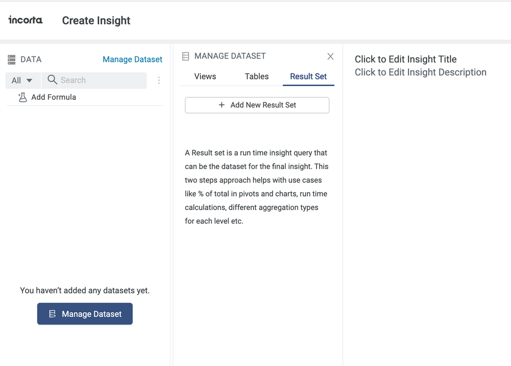 You start by creating a new insight and navigating to the Analyzer UI. You now have a new option under ‘Manage Dataset’. In addition to Views and Tables, you have another option called Result Set.