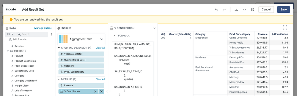 Create a result set, just like you create an insight. In this case, we create an aggregate table with a level based measure for the % contribution