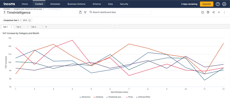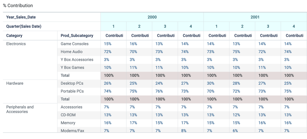 As a business user, I want to create an insight that shows each subcategory's revenue contribution to the total category in a pivot table. I want to pivot the data by Year and Month to see the trend in % contribution.