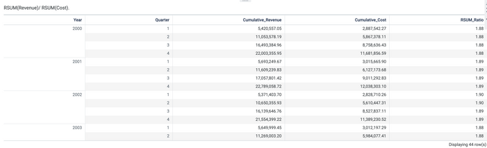 To do this, you can first create a result set with the cumulative revenue and cumulative cost as running totals. Next, create an insight with a formula that calculates the ratio.