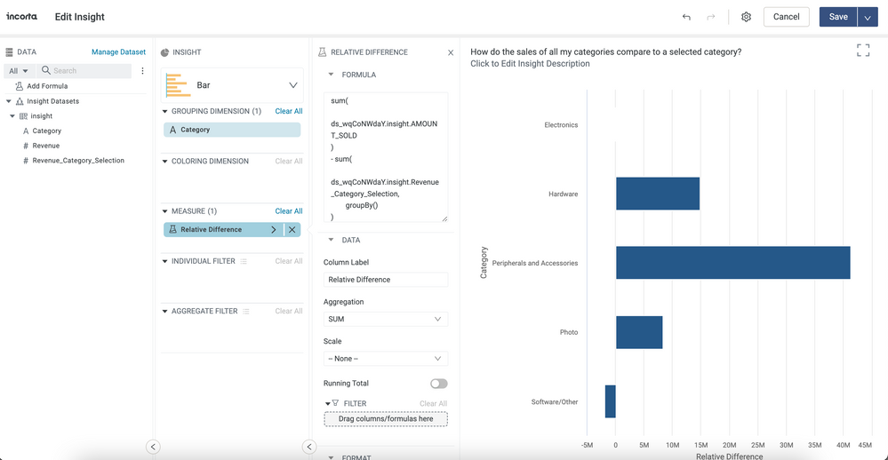 With this result set defined, next we create the insight and use the level based measure with an empty group by (). This helps us determine the relative different between a given category dimension and the selected presentation variable category dimension.