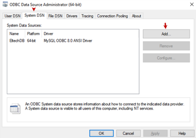 - For the purpose of this article, the PostgreSQL Server ODBC data source will be created under the System DSN tab. To start creating the connection, press the Add button:
