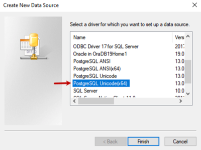 A dialog box Create a new data source opens. Select PostgreSQL Unicode(x64) driver and click on Finish.