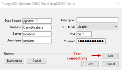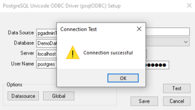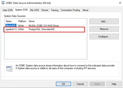As you can see, the connection has been established successfully. Click on Save to create the system DSN. Back to the System DSN screen, you can see the pgadmin13 DSN has been created.