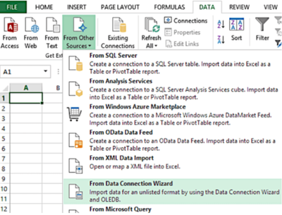 1-Open Excel (blank worksheet) and navigate to the Data tab, in the Get External Data section select From Other Sources > From Data Connection Wizard. If you do not see From Data Connection Wizard in the list of options you can enable it from Excel > Options > Data.