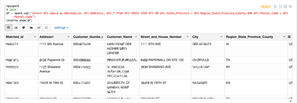 df = spark.sql("select df1.Gpoid as Matched_id, df1.Address1, df2.* from df2 CROSS JOIN df1 ON df1.State_Province = df2.Region_State_Province_County AND df1.Postal_Code = df2.Postal_Code")