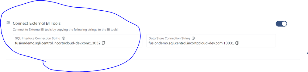 In the Cloud Console, click on your cluster, go to the Configuration tab, enable external BI tools connections, and copy the SQL Interface connection string; this is the JDBC URL that will be used to configure the connection in the external tool.