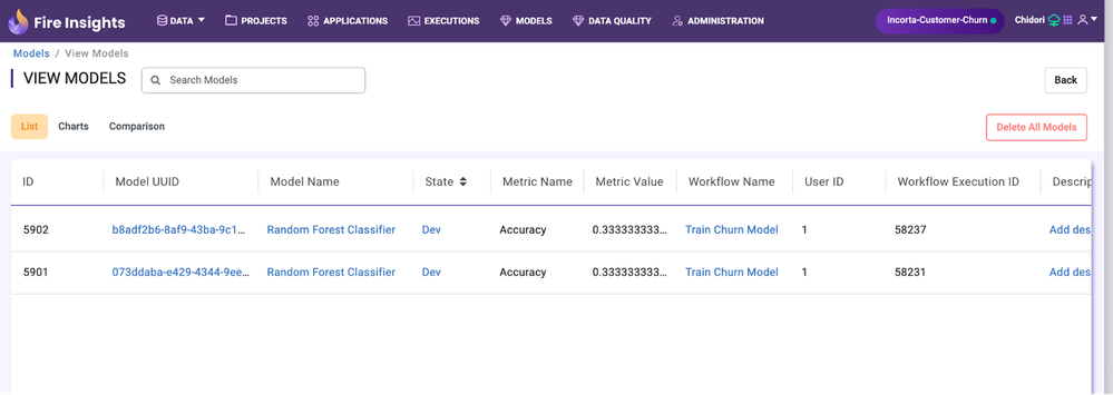 In the Sparkflows Model Registry, the model summary, the hyper-parameter, performance metrics, feature importances and model path are stored for the executed model. It allows users to compare the different models.